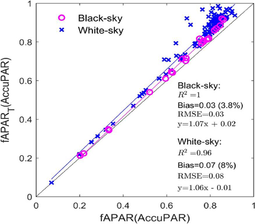 Fig.1. Comparison of the AccuPAR estimated four-stream fAPAR and the two-stream fAPART under black- (magenta) and white-sky (blue) conditions