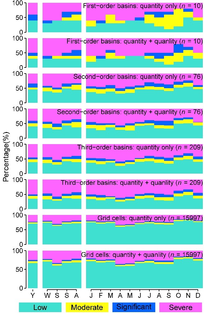 研究結果系統地揭示了中國水資源短缺現狀在多個時空尺度上所具有的顯著不均衡性,以及不同部門與行業對水量和水質需求在不同時間尺度上的變異性和不同區域尺度上的差異性。本研究的重要意義在于為全面和深入理解中國水資源短缺的時空特征提供了新的研究視角與結果支持,進一步可以為緩解中國缺水的措施制定以及水資源和水環境的可持續發展提供重要的參考。