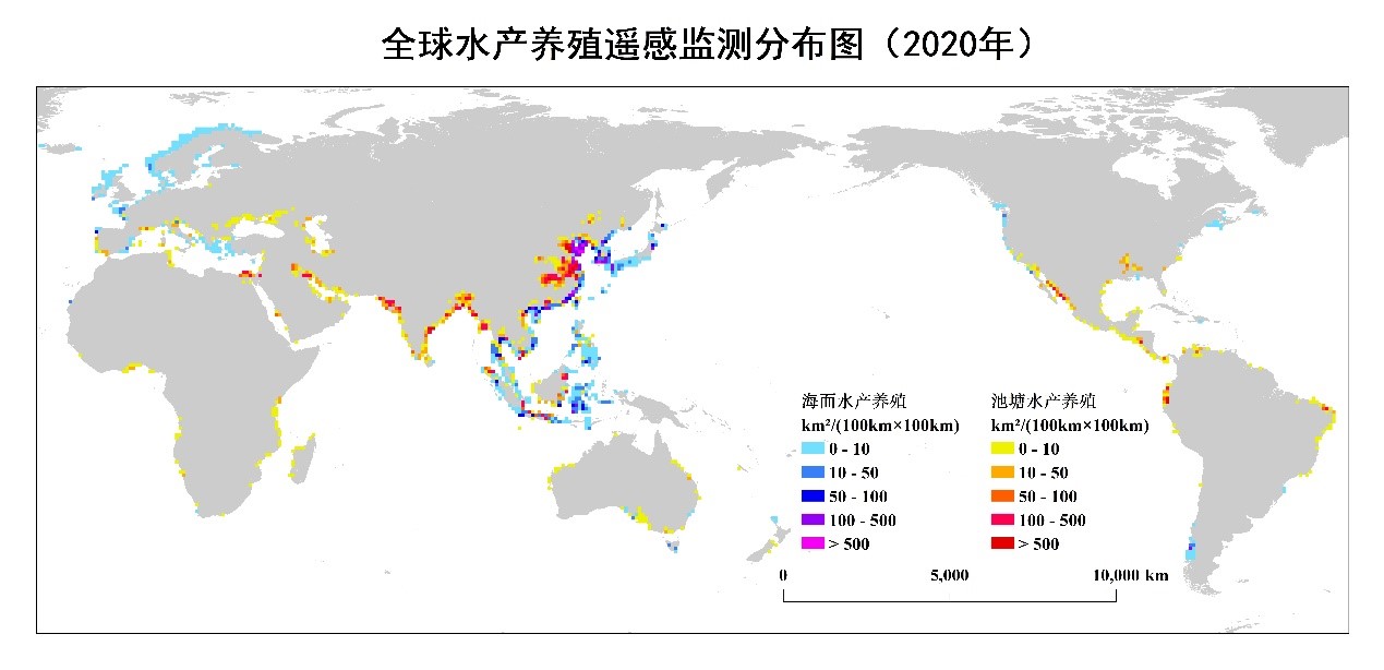 圖1 2020年全球水產(chǎn)養(yǎng)殖遙感監(jiān)測分布圖(海岸帶區(qū)域,百公里格網(wǎng)中海面水產(chǎn)養(yǎng)殖與池塘水產(chǎn)養(yǎng)殖同時存在時,僅對海面水產(chǎn)養(yǎng)殖進行顯示)