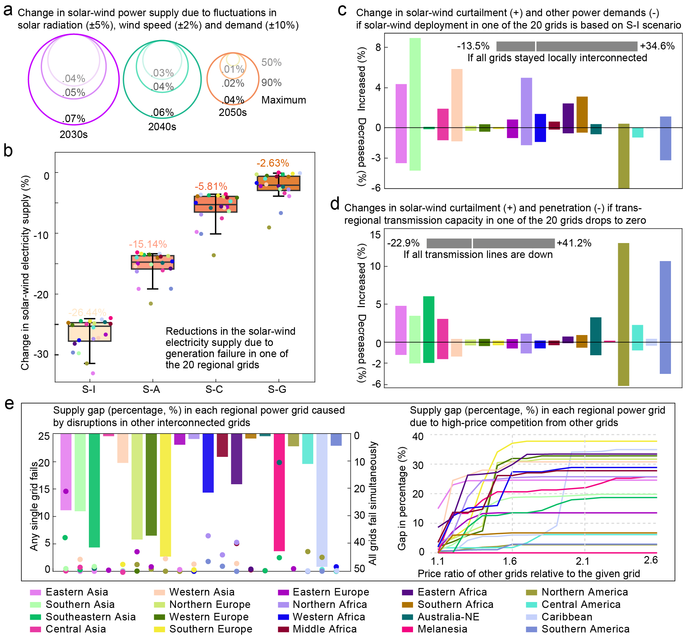 全球互聯(lián)大幅提升了系統(tǒng)應對氣候變化、極端天氣、政策不協(xié)調、地緣政治沖突與市場競爭等不確定性的能力。太陽輻射、風速或負荷發(fā)生波動導致的全球電力供應不確定性低于0.1%;在極端天氣下,單一區(qū)域斷電導致的風光供應損失僅為2.6%。然而,全球互聯(lián)的系統(tǒng)穩(wěn)定性受到地區(qū)政策與地緣因素的干擾。若各區(qū)域轉向能源自給,將打破供需平衡,導致亞洲與非洲部分區(qū)域的風光削減量大幅上升。在極端情形下,全球電力削減量可能上升逾40%。此外,輸電節(jié)點故障、互聯(lián)線路中斷及價格競爭也可能放大區(qū)域風險。例如,亞洲東部若失去與東歐的連接,電力缺口可達15%。研究強調,確保全球互聯(lián)系統(tǒng)長期可靠性,需依賴穩(wěn)定的地緣環(huán)境、協(xié)調的政策機制與公平的市場規(guī)則。