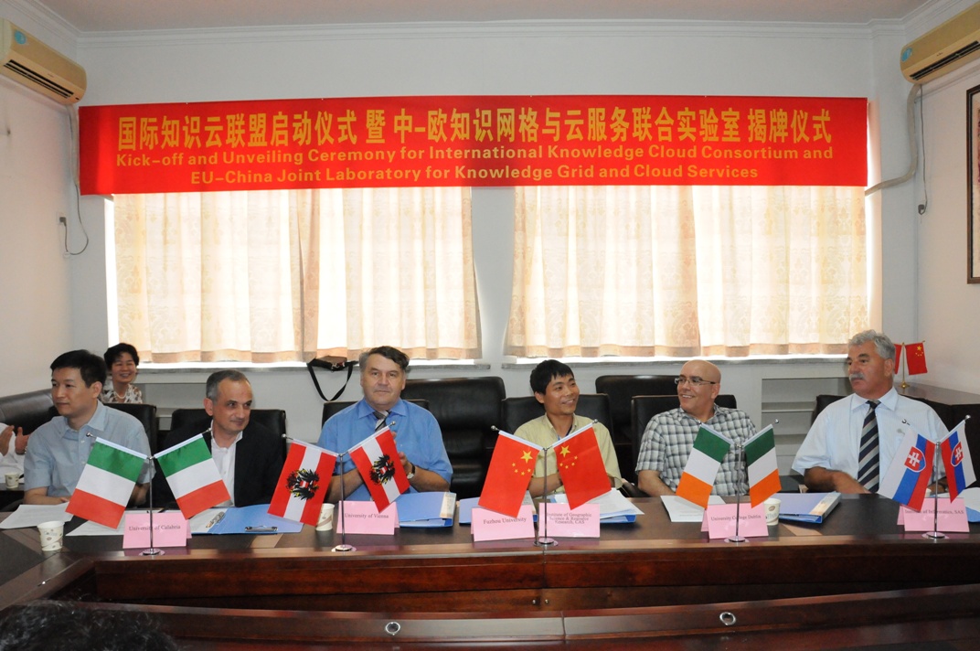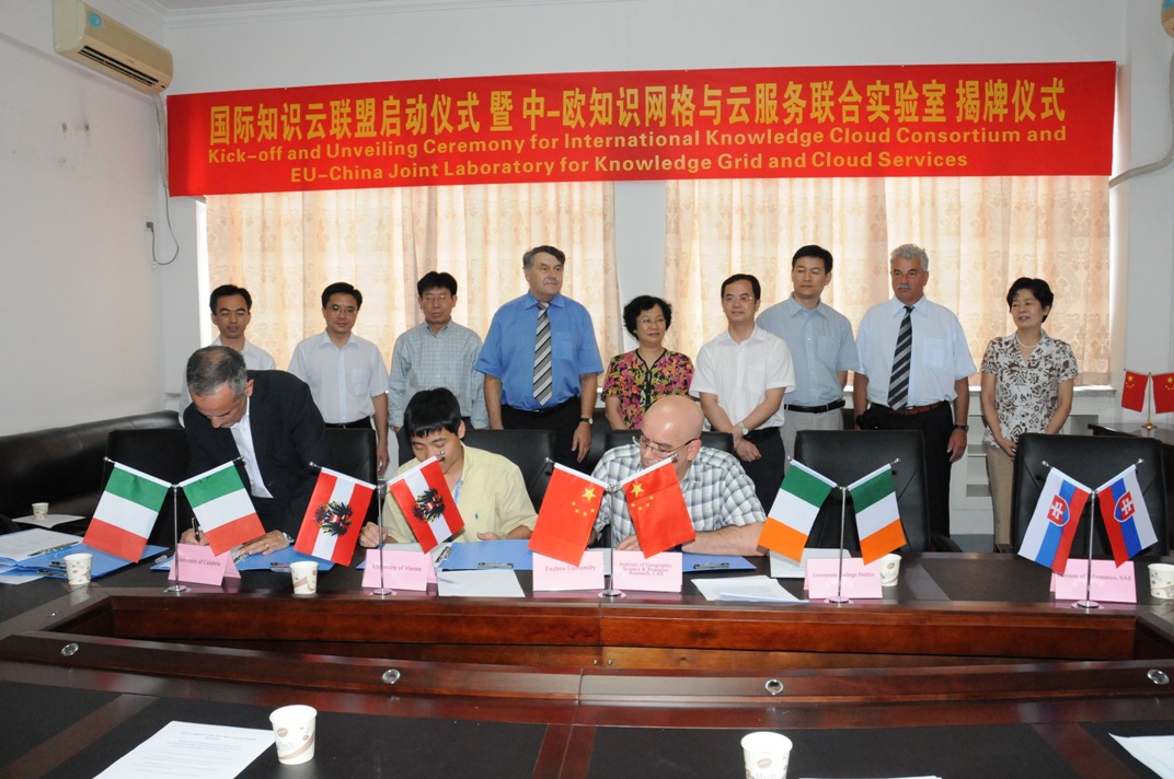 2011年6月28日下午,在“第一屆空間數據挖掘與地理知識服務國際學術會議”前夕,在福州大學怡山校區科學樓舉行了“國際知識云聯盟(International Knowledge Cloud Consortium, IKCC)”啟動儀式即“中-歐知識網格與云服務聯合實驗室”(EU-China Joint Laboratory of Knowledge Grid and Cloud Services)揭牌儀式。