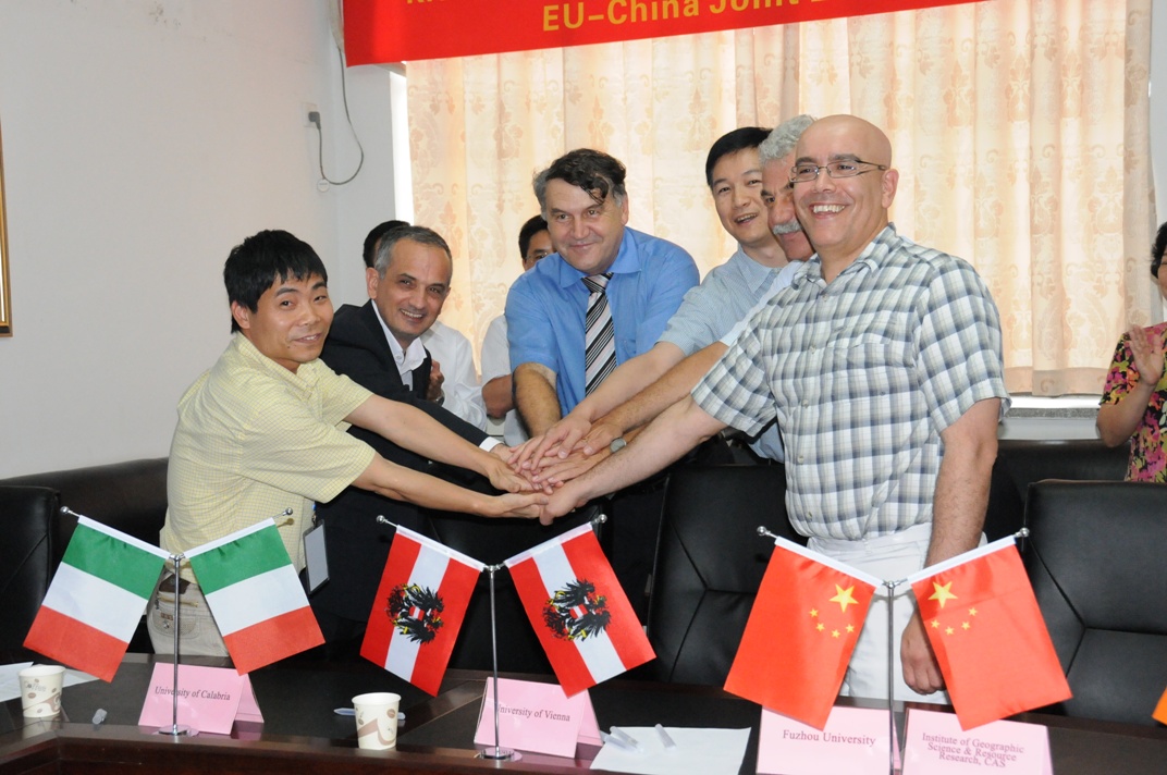 來自福建省科技廳、中國科學院地理科學與資源研究所、福州大學以及歐洲伙伴單位的領導和專家共同見證了揭牌儀式,福建省科技廳杜民副廳長、中國科學院地理科學與資源研究所副所長周成虎研究員、福州大學副校長何明華教授出席了揭牌儀式。資源與環境信息系統國家重點實驗室常務副主任陸鋒研究員代表實驗室在聯盟章程上簽字。