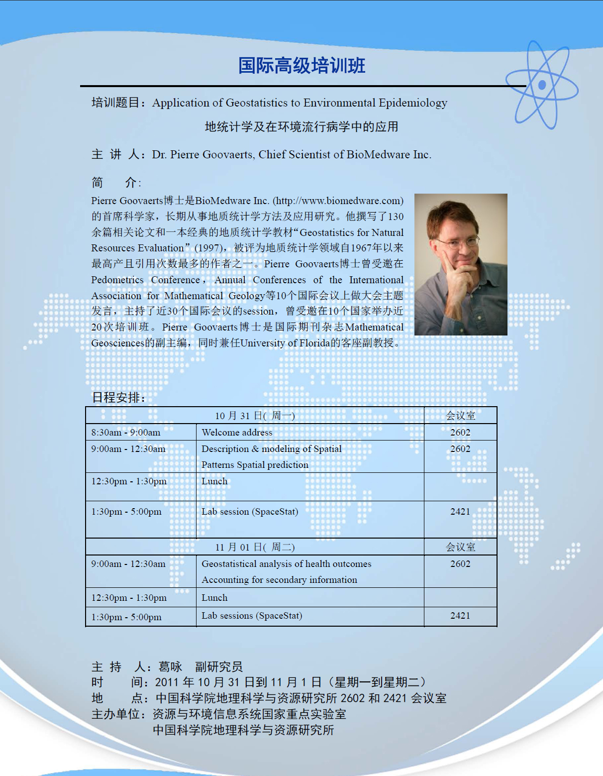 國際培訓班日程安排:地統計學及在環境流行病學中的應用