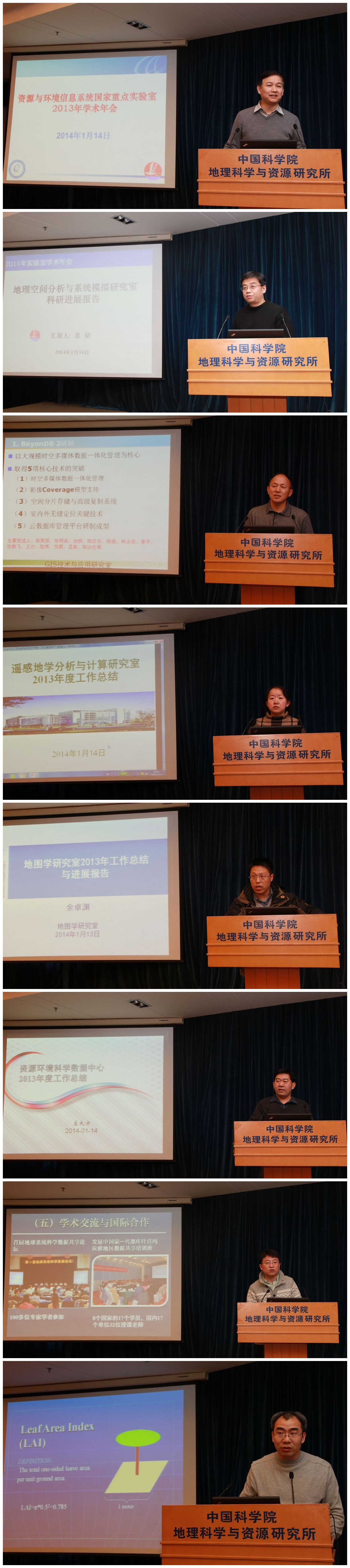裴韜副主任、陳榮國主任、楊曉梅主任、余卓淵副主任、徐新良副主任、王卷樂副主任分別代表地理空間分析與系統模擬研究室、地理信息技術與應用研究室、遙感地學分析與計算研究室、地圖學研究室、資源環境科學數據中心和地球系統科學信息共享中心作了研究室(中心)的2013年度科研進展報告。