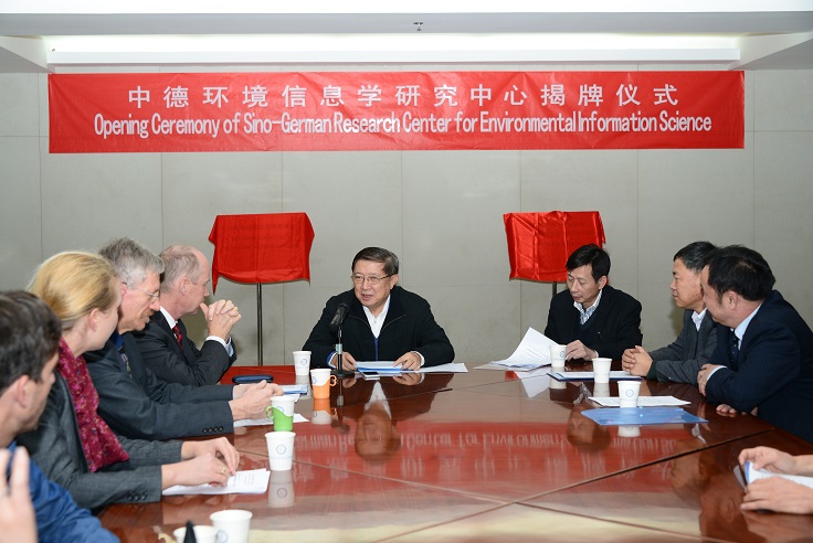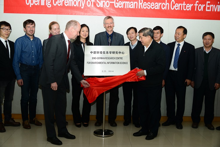 中德環境信息學研究中心(Sino-German Research Center for Environmental Information Science)揭牌儀式于2014年11月22日在中國科學院地理科學與資源研究所隆重舉行。原中華人民共和國科技部部長徐冠華院士為該中心揭牌并發表重要講話。中國科學院地理科學與資源研究所所長葛全勝研究員、中國科學院地理科學與資源研究所副所長于貴瑞研究員、國家自然科學基金委中德科學中心常務副主任陳樂生教授、德國亥姆霍茲國家研究中心聯合會駐中國首席代表何宏博士、德國亥姆霍茲聯合會研究生院院長Olaf Kolditz教授、德國赫姆霍茲環境研究中心環境研究室主任Gerrit Schuermann教授、德國航空航天中心Claudia Künzer博士、基爾大學Jens Olaf Delfs博士、德國赫姆霍茲環境研究中心環境信息學研究室陳翠博士、卡爾斯魯理工學院魏建輝博士等出席揭牌儀式。葛全勝研究員、Olaf Kolditz教授、陳樂生教授、何宏博士分別致辭,于貴瑞研究員主持了揭牌儀式。