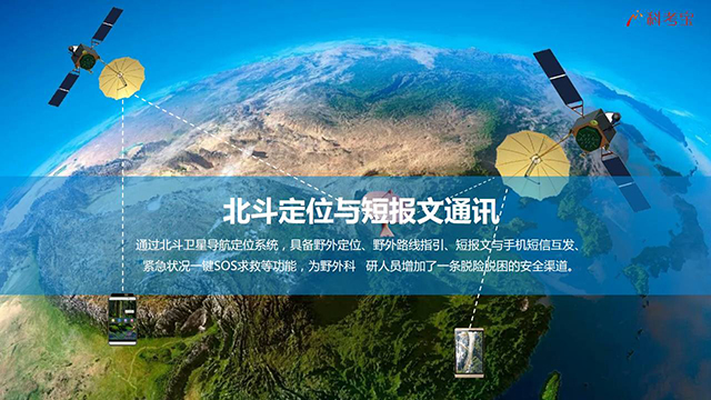 通過北斗衛星導航定位系統,具備野外定位、野外路線指引、短報文與手機短信互發、緊急狀況一鍵SOS求救等功能,為野外科 研人員增加了一條脫險脫困的安全渠道。
