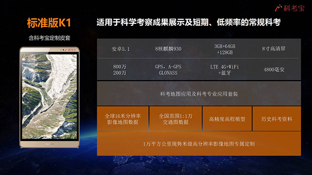 科考寶產品由華為定制平板、科考地圖應用及科考專業應用App套裝、高分辨遙感影像地圖構成。本次發布了標準版K1和專業版K1 Pro兩個版本,標準版適用于科學考察成果展示及短期、低頻率的常規科考,包含1萬平方公里現勢米級高分辨率的專屬定制影像圖;